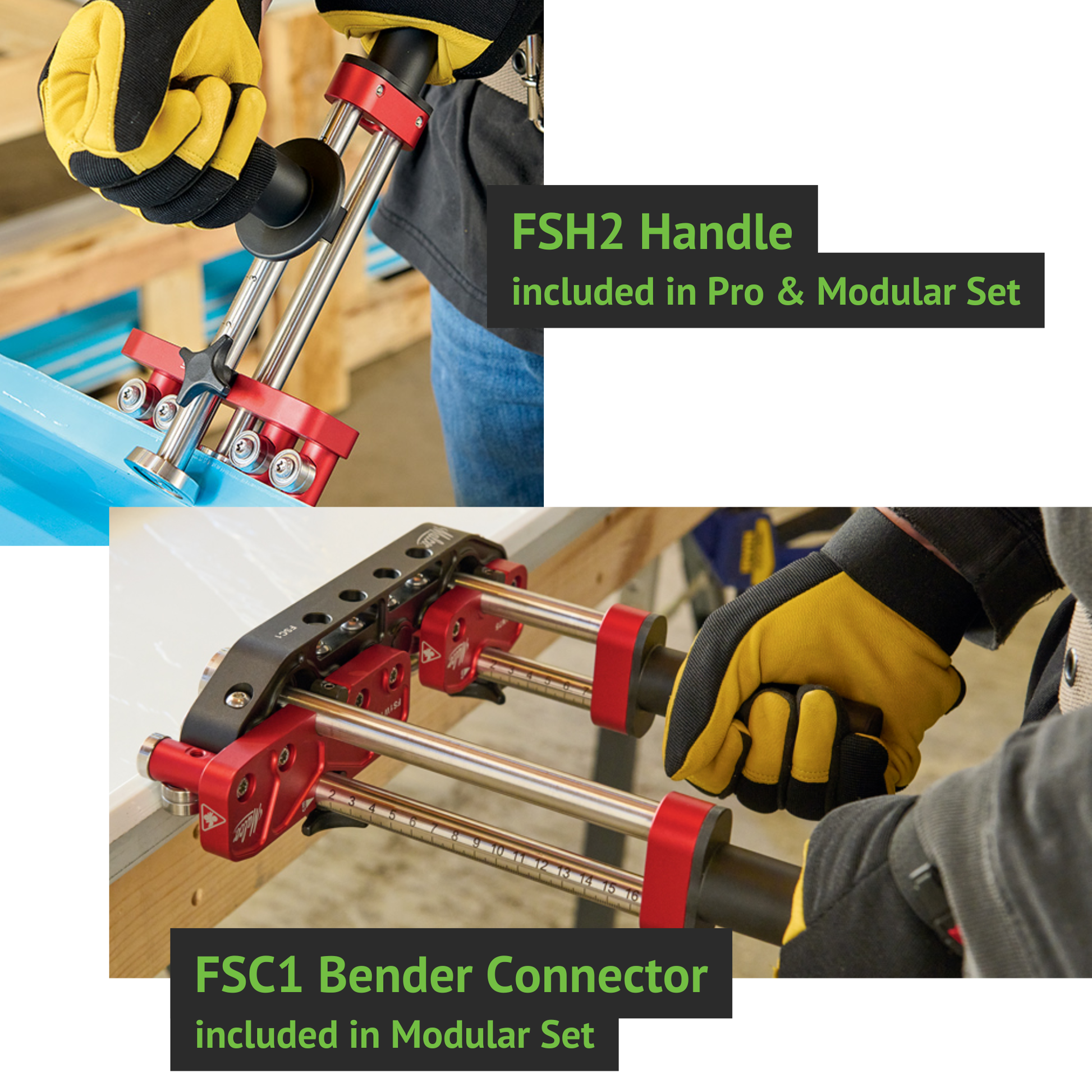 With adjustable roller spacing for different materials and thicknesses, and an exclusive angled roller that helps prevent scratching on 90° bends, the FS1N165 is built for consistent results in the field. Premium CNC aluminum and stainless-steel components improve stability, resist corrosion, and hold up to daily professional use. For a modular workflow, this bender can also be paired with the FSC1 Bender Connector to create a two-station setup for added control on longer bends.
