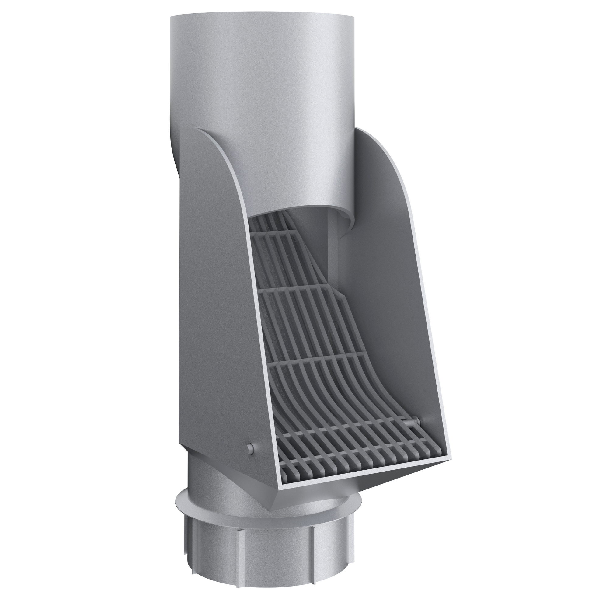 This “chute” style cleanout takes advantage of the high-flow design found in Nordic Steel and Lindab half-round gutter systems. Water passes through the integrated grid and into the drain, while leaves and debris are diverted and discharged naturally by gravity and water velocity.