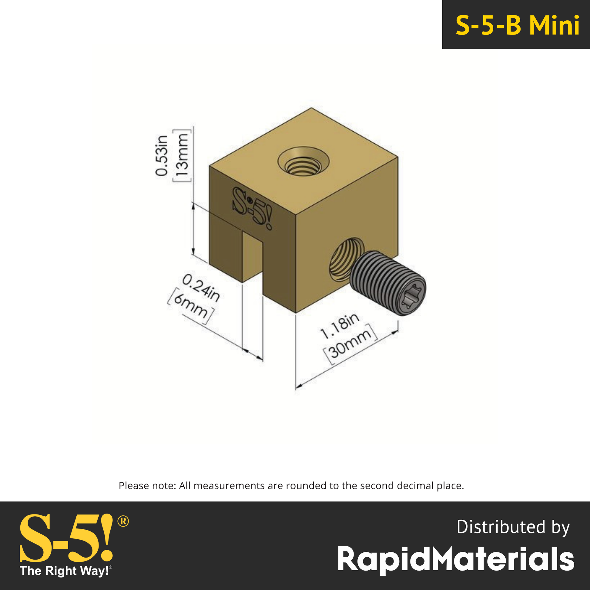 Shorter than the regular S-5-B, the S-5-B mini (B for brass) metal roof panel seam clamp allows architects to maintain that theme with all rooftop mounted equipment and accessories using an attachment device that features permanence and durability consistent with the roof itself. The S-5-B mini clamp is specifically designed for double-folded copper standing seam roof panel profiles. *S-5!® Mini clamps are not compatible with, and should not be used with, S-5! SnoRail /SnoFence or ColorGard® snow retention systems. If installing snow retention systems such as ColorGard, make sure to use the regular S-5-B. The S-5-B Mini Brass clamp comes complete with one [1] 3/8″x24 x 0.50″ round nose set screw. All hardware is stainless steel. The Hex bolt is no longer standard with S-5! mini clamps.