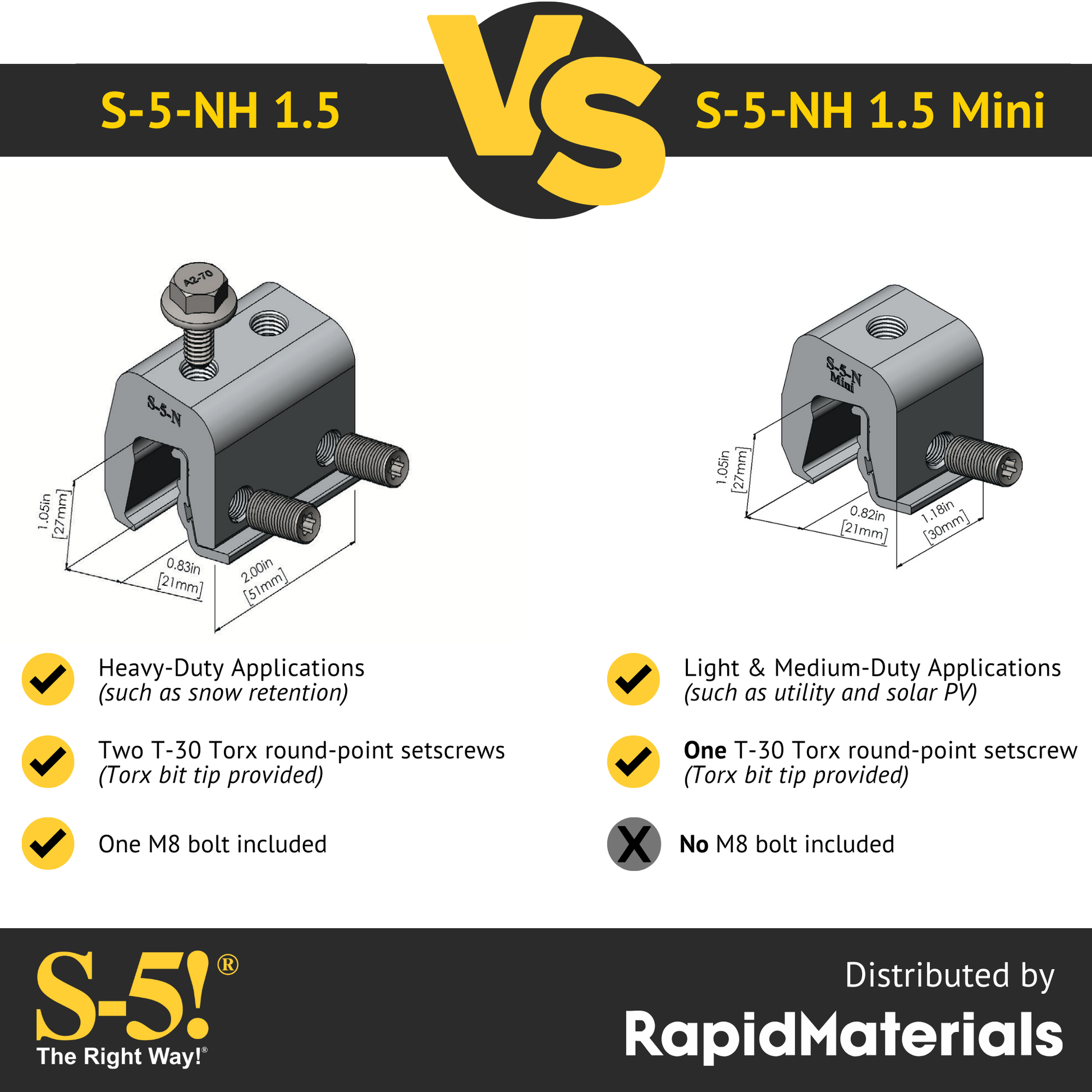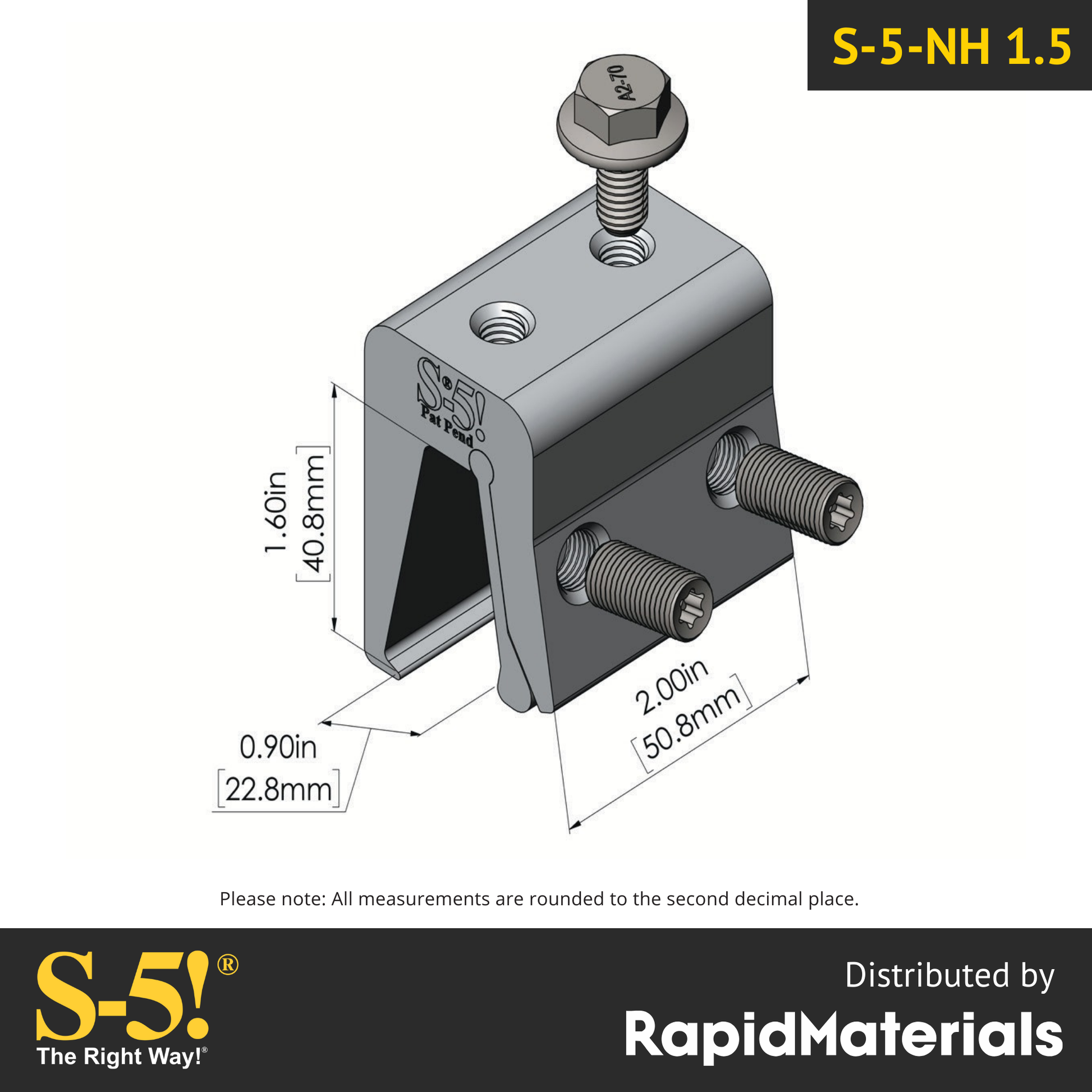 - The S-5-NH 1.5 clamp is often used in conjunction with S-5! ColorGard snow retention systems and other heavy-duty applications.