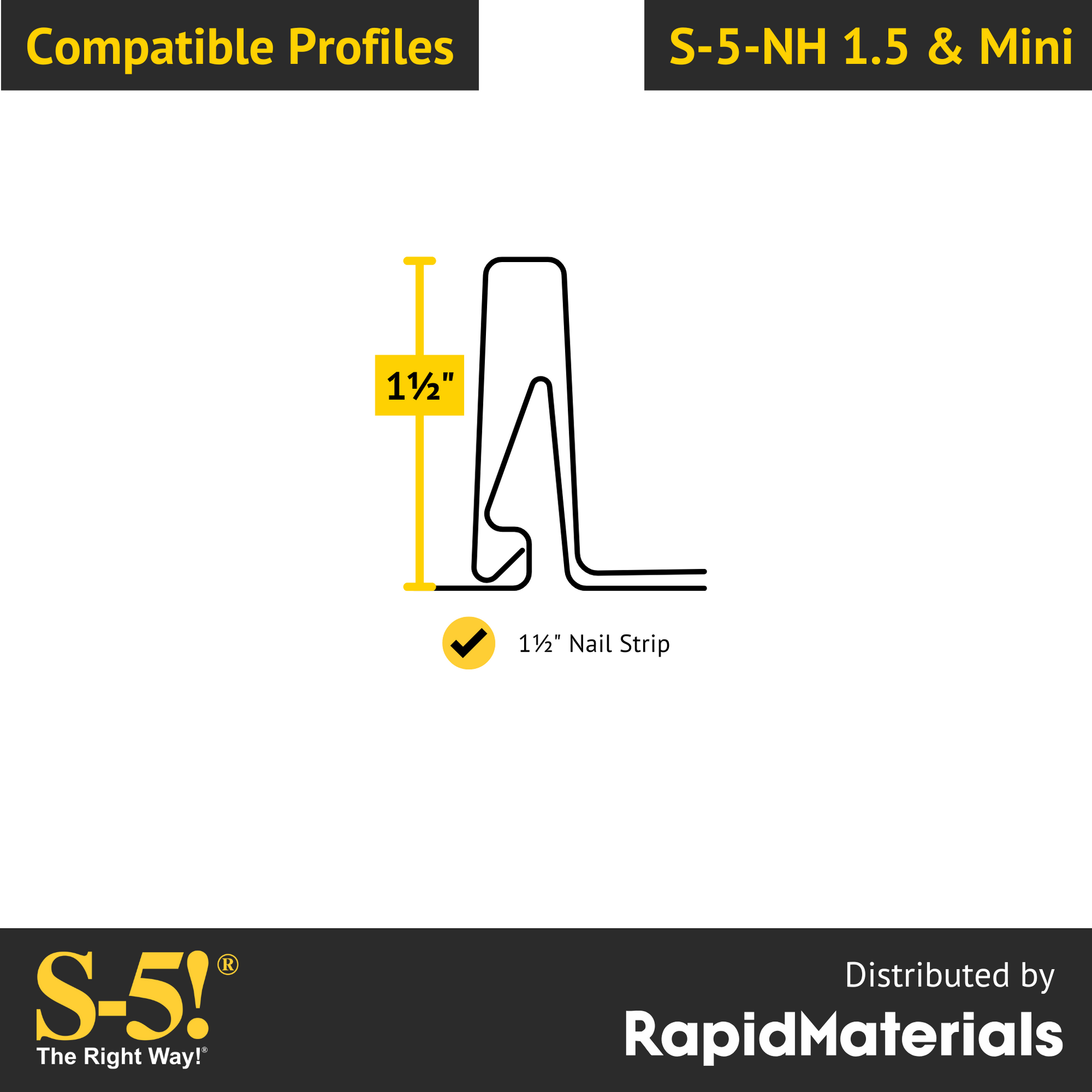 The S-5-NH 1.5 clamp is designed for 1-1/2″ nail strip profiles with a wider horizontal dimension. It is typically used with profiles that have a width greater than 0.475″ (12mm) and less than or equal to 0.800″ (20.32mm).
