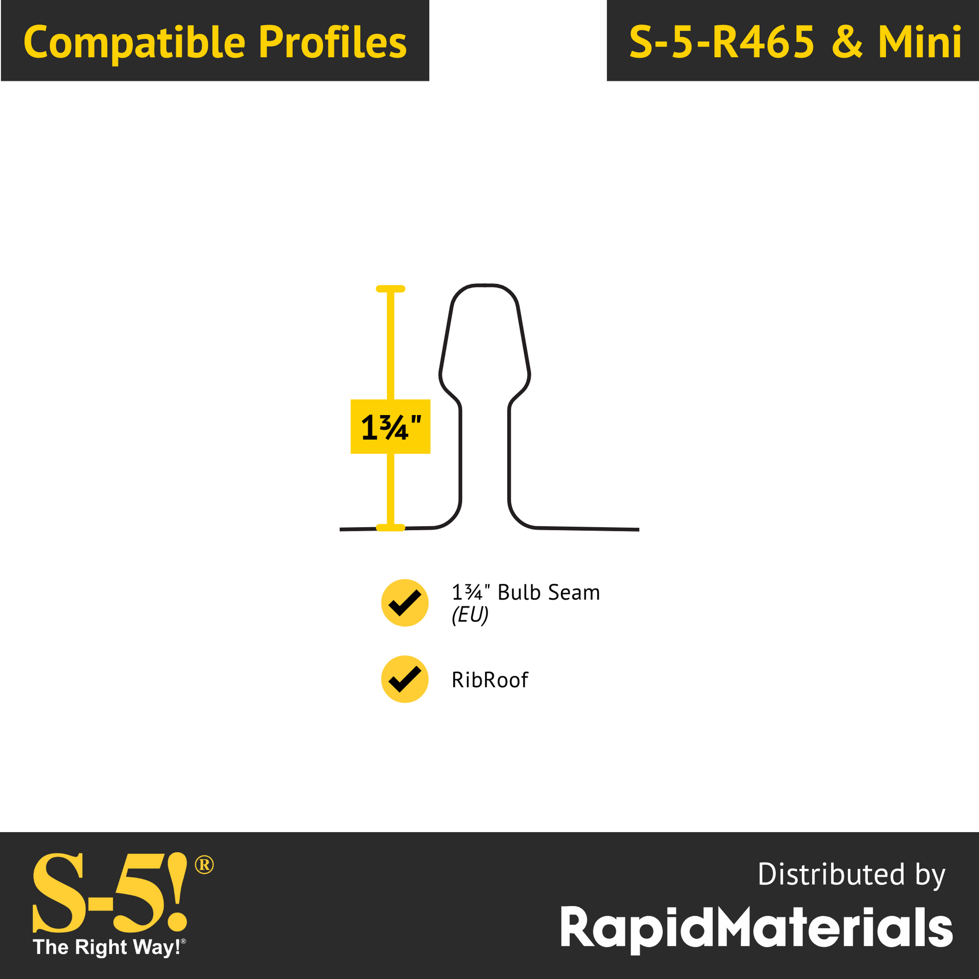 The S-5-R465 Mini is a specialized clamp designed to fit specific roof profiles such as the Zambelli RIB-ROOF 465, McElroy Metal’s Mirage II, Rib Roof Metal Systems, and similar roofs. It is an improved version of the S-5-R Mini, offering more than three times the holding strength.