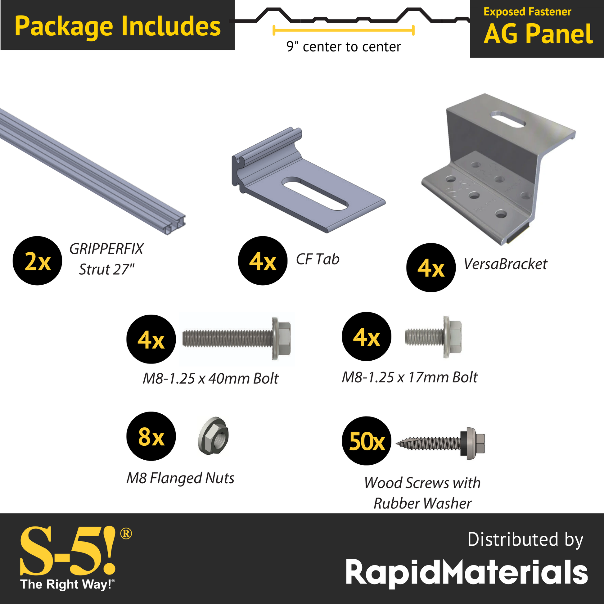 This is simple to determine using a tape measure. Simply measure the center to center distance of the major ribs. If it is 9″, you have an AG Panel roof.